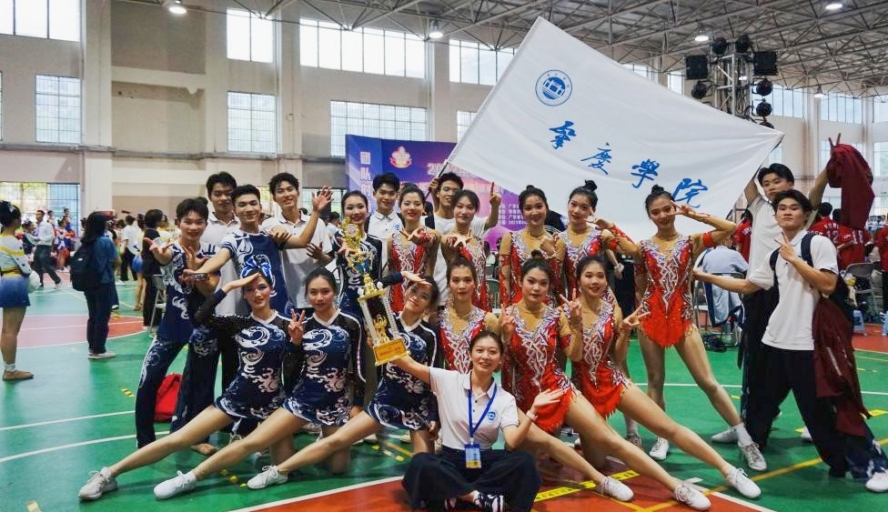 本网讯 4月21至23日,2022年广东省大学生啦啦操锦标赛暨第一届全国学生(青年)运动会广东校园组代表团大学啦啦操项目选拔赛在华南农业大学珠江学院举行。beat365首次参加本项赛事,共派出21名学生参加5个团体项目的竞逐,最终斩获2金、2银、1铜,获得乙组团体总分第一的好成绩,在兄弟院校面前展示了良好的风采。