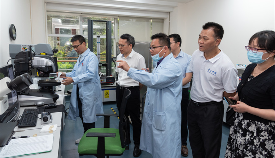 第一阶段,胡文涛带队赴广东风华高新科技股份有限公司(以下简称“风华高科”)考察交流。在风华高科副总裁付振晓的陪同下,随行人员参观了新型电子元器件关键材料与工艺国家重点实验室,深入了解实验室发展历程、取得的荣誉和科技成就,与一线科研工作者进行交谈,了解电子元器件领域的科技动态和创新前沿。胡文涛强调要充分学习借鉴风华高科在高水平科研平台建设方面的经验,以电子信息硕士学位点建设为抓手,强化校企合作,打造产学研深度融合平台与实践基地,加强与风华高科在人才培养、科学研究、基地建设等方面的交流合作,不断提升beat365科研创新能力、人才培养质量和校企合作水平。